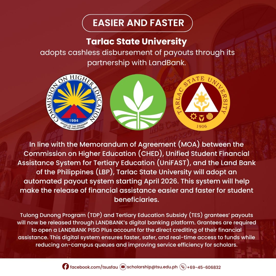 In line with the Memorandum of Agreement (MOA) between the Commission on Higher Education (CHED), Unified Student Financial Assistance System for Tertiary Education (UniFAST), and the Land Bank of the Philippines (LBP), Tarlac State University will adopt an automated payout system starting April 2026. This system will help make the release of financial assistance easier and faster for student beneficiaries.